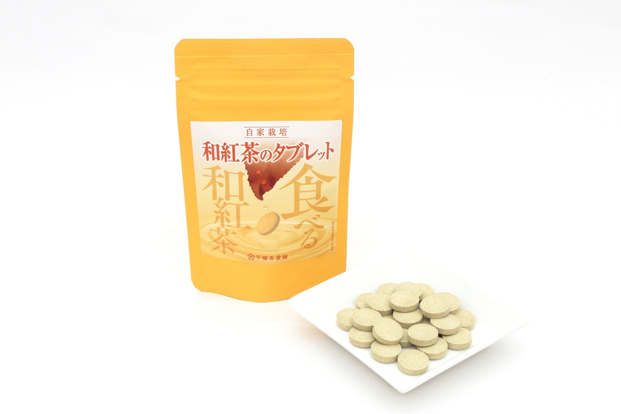 上質な2番茶を萎凋(いちょう)、醗酵して和紅茶を作ります。微粉末状に加工しタブレットの原材料にしています。お口に含むと和紅茶の香りが漂います。